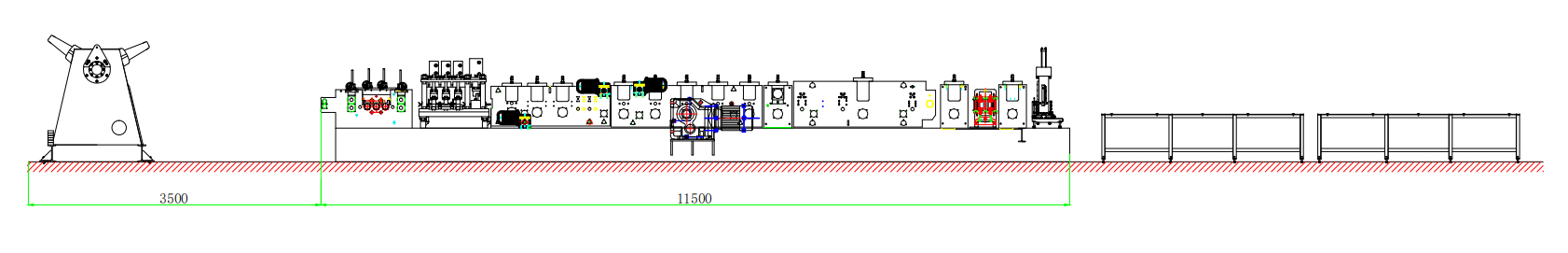 جهاز فك اللفائف ← جهاز التغذية والتسوية ← جهاز القطع المسبق واللكم الهيدروليكي ← نظام التشكيل بالدرفلة ← قطع هيدروليكي ← رف الخروج