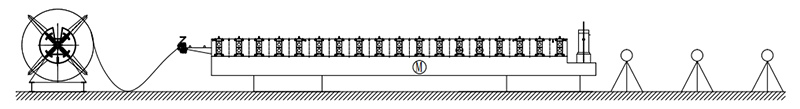 فك اللفائف → جهاز القطع المسبق اليدوي → يٌطعم جهاز التوجيه → نظام التشكيل بالدرفلة → جهاز قطع الأعمدة الهيدروليكي → رف الخروج